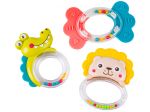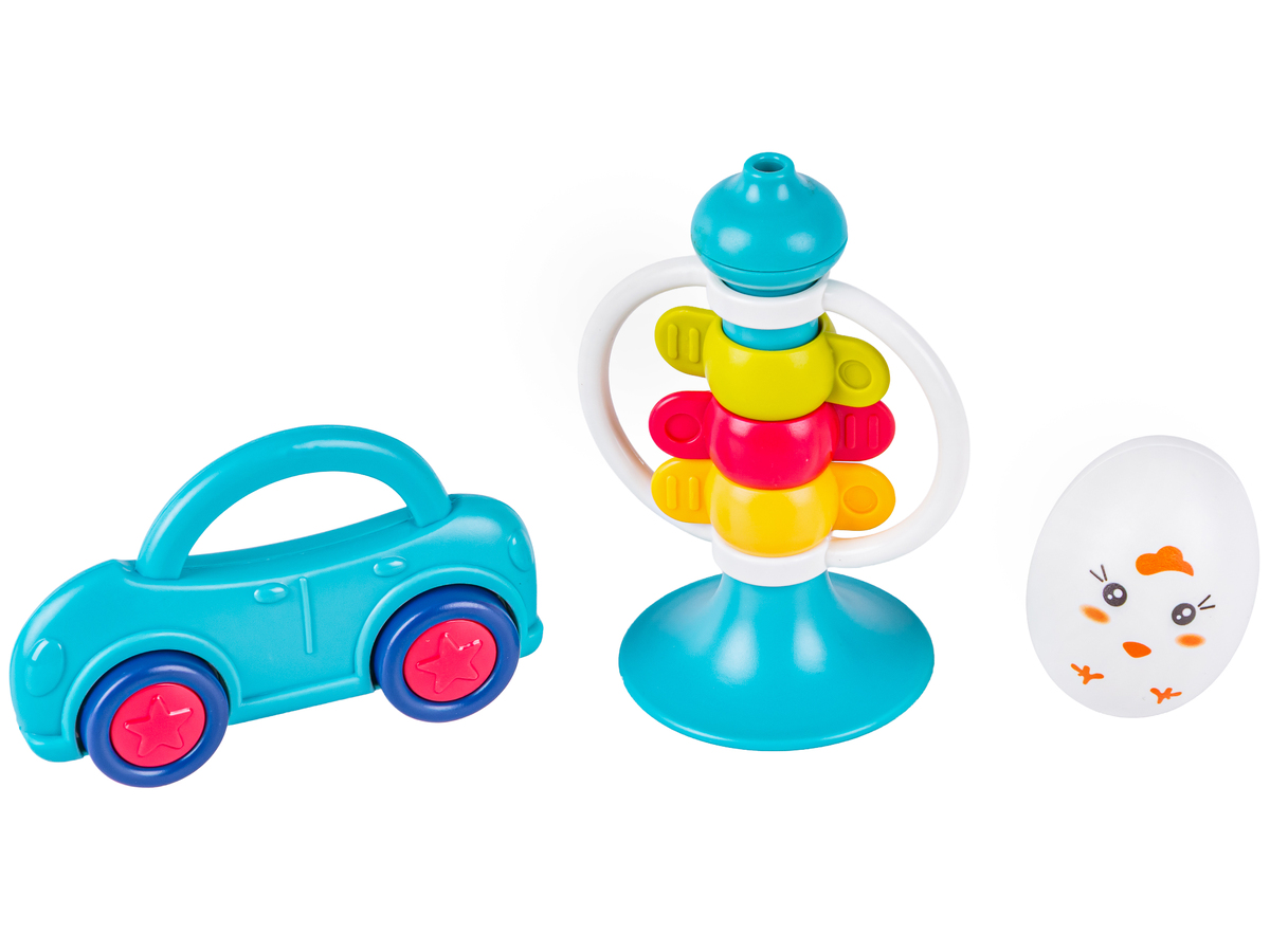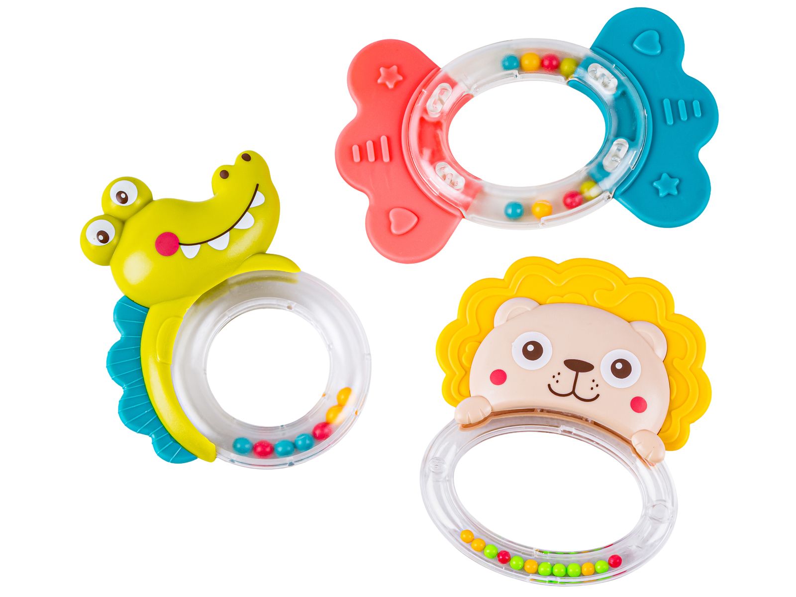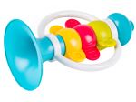 Każda grzechotka jest wyjątkowa - oprócz ciekawego wzornictwa, niektóre posiadają kolorowe kuleczki w przeźroczystych tunelikach, koraliki wypukłe do przesuwania po pałąku, obrotowe elementy na trąbce lub nawet ruchome koła w samochodziku.