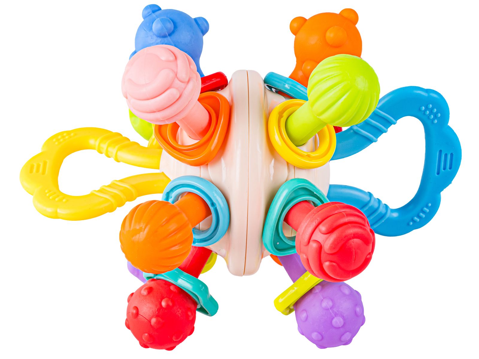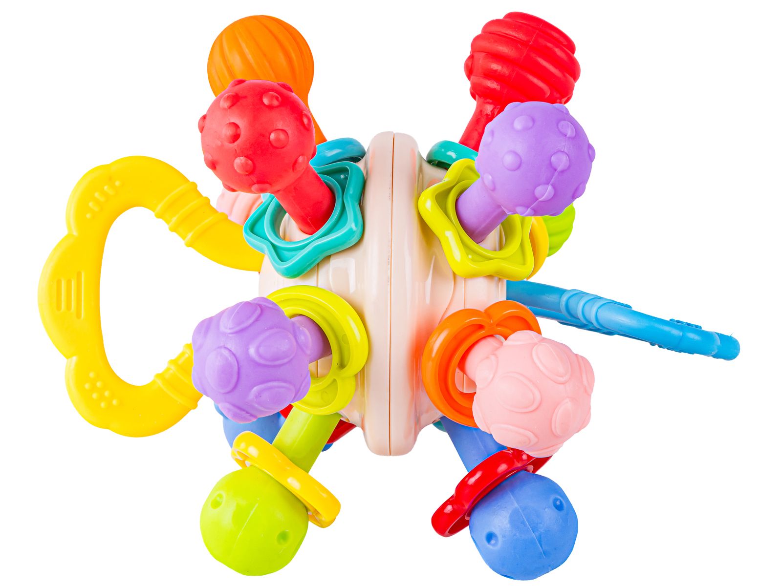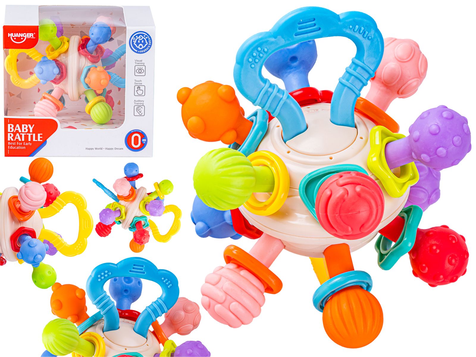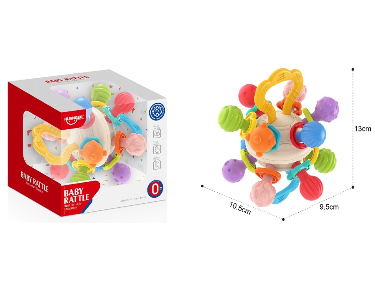 Zabawka została zaprojektowana z myślą o małych dłoniach niemowląt. Dzięki temu jest łatwa do chwytania i bezpieczna dla dzieci. Różnorodność kształtów i kolorów przyciąga uwagę oraz stymuluje rozwój motoryczny i sensoryczny.