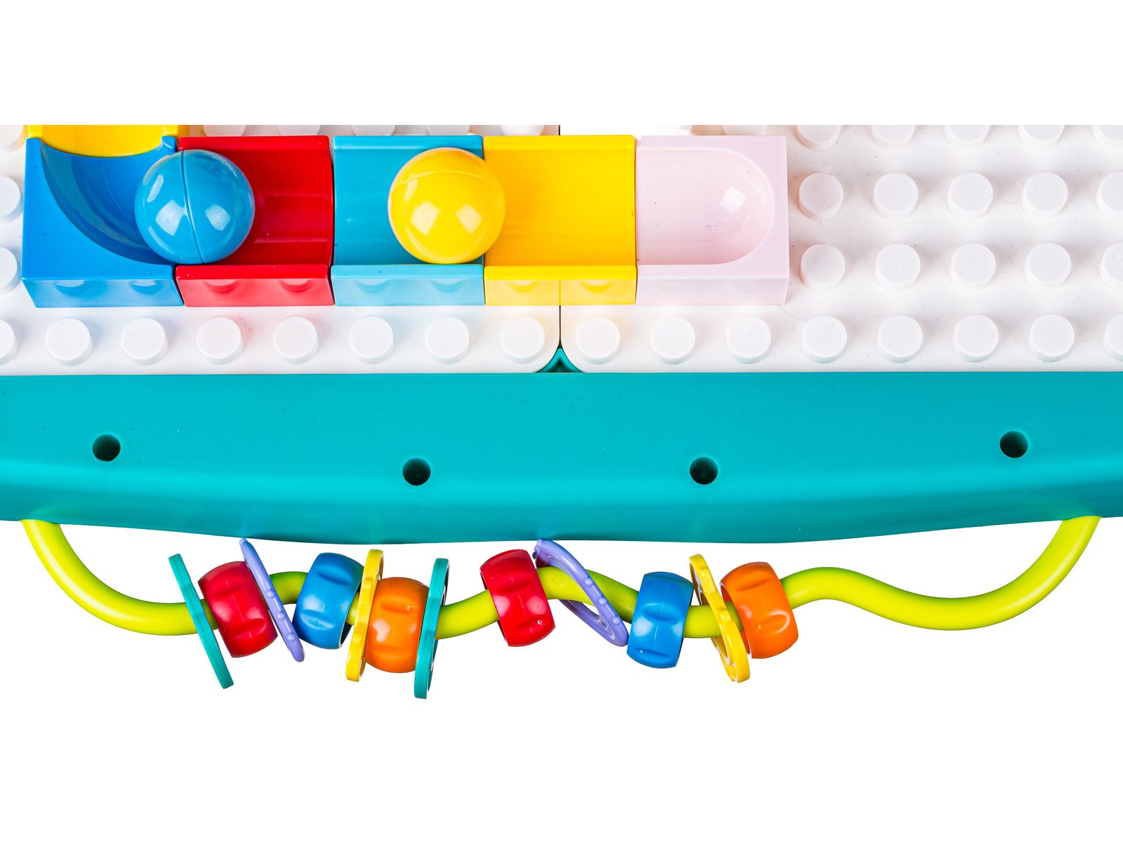 Stolik posiada dwufunkcyjny blat - oprócz głównego panelu na odwrocie znajdziemy podstawę do zabawy klockami. Mechanizm przy nóżkach został tak zaprojektowany aby móc w szybki i bezproblemowy sposób go odwrócić.