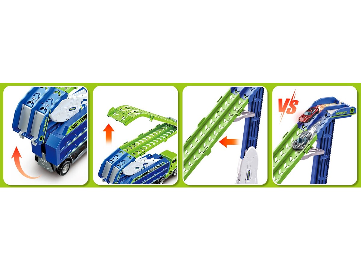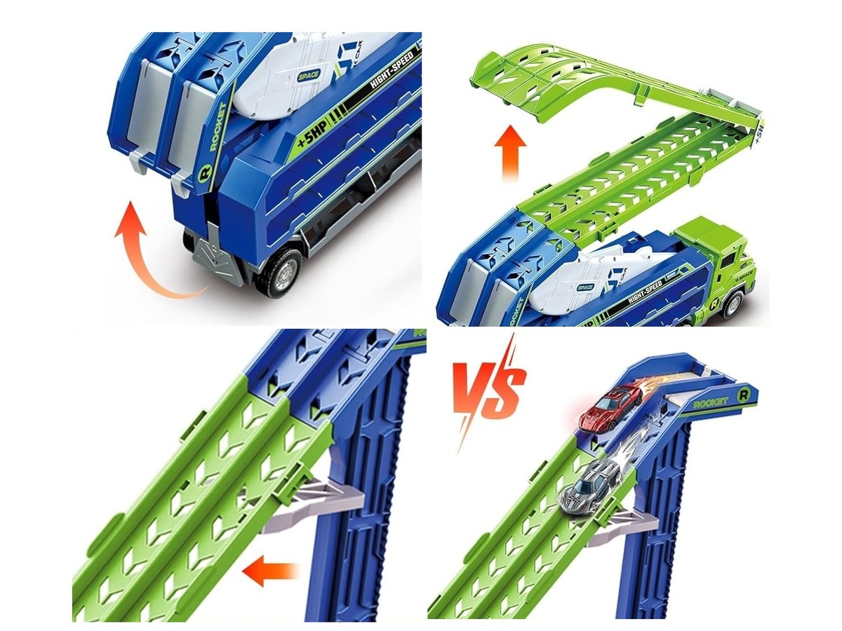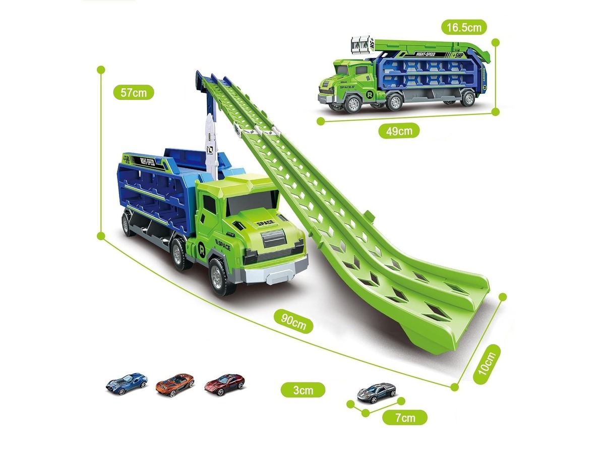 Wyjątkowa ciężarówka transportowa to jednocześnie pojazd i tor ze zjeżdżalnią dla samochodów. Zestaw dostarcza mnóstwa możliwości fantastycznej zabawy, jazdę samochodzikami, wyścigi, zjeżdżanie czy też bezpieczny transport autek w specjalnie przygotowanych do tego kabinach po obu bokach tira. Znajdziemy tam aż 20 miejsc do transportowania, dzięki czemu dziecko może przewozić także inne samochodziki ze swojej prywatnej kolekcji.