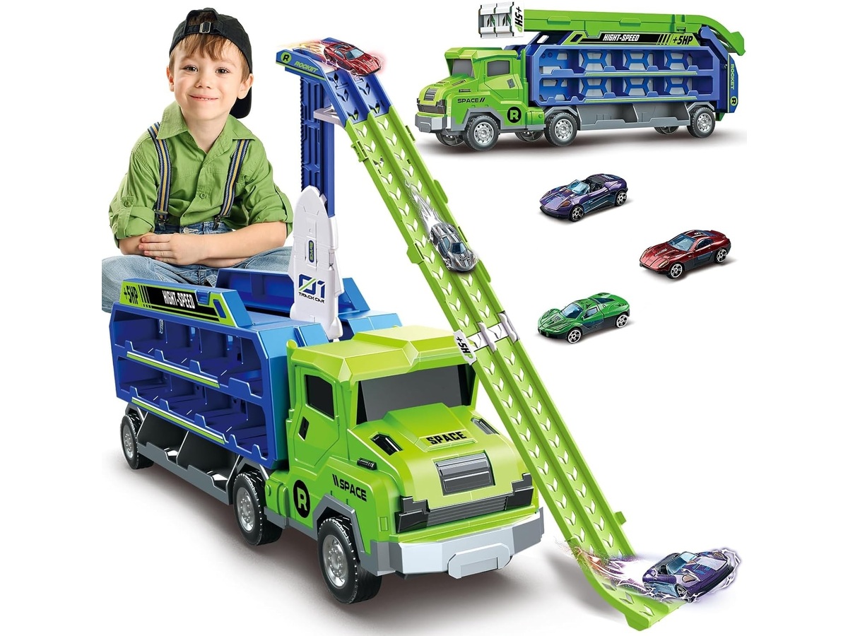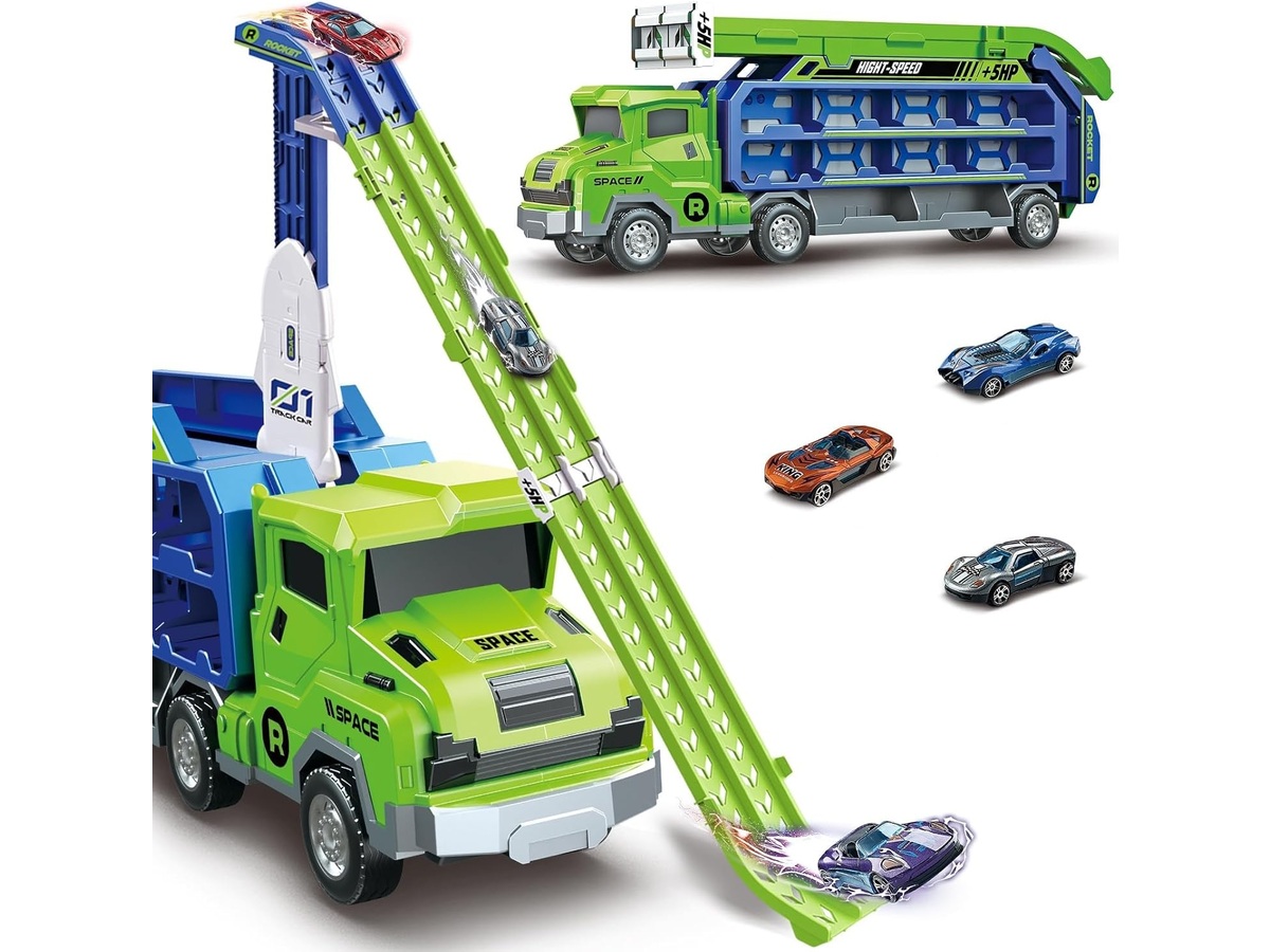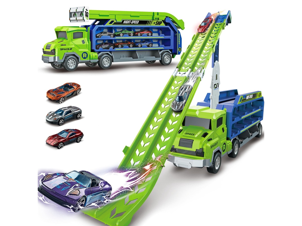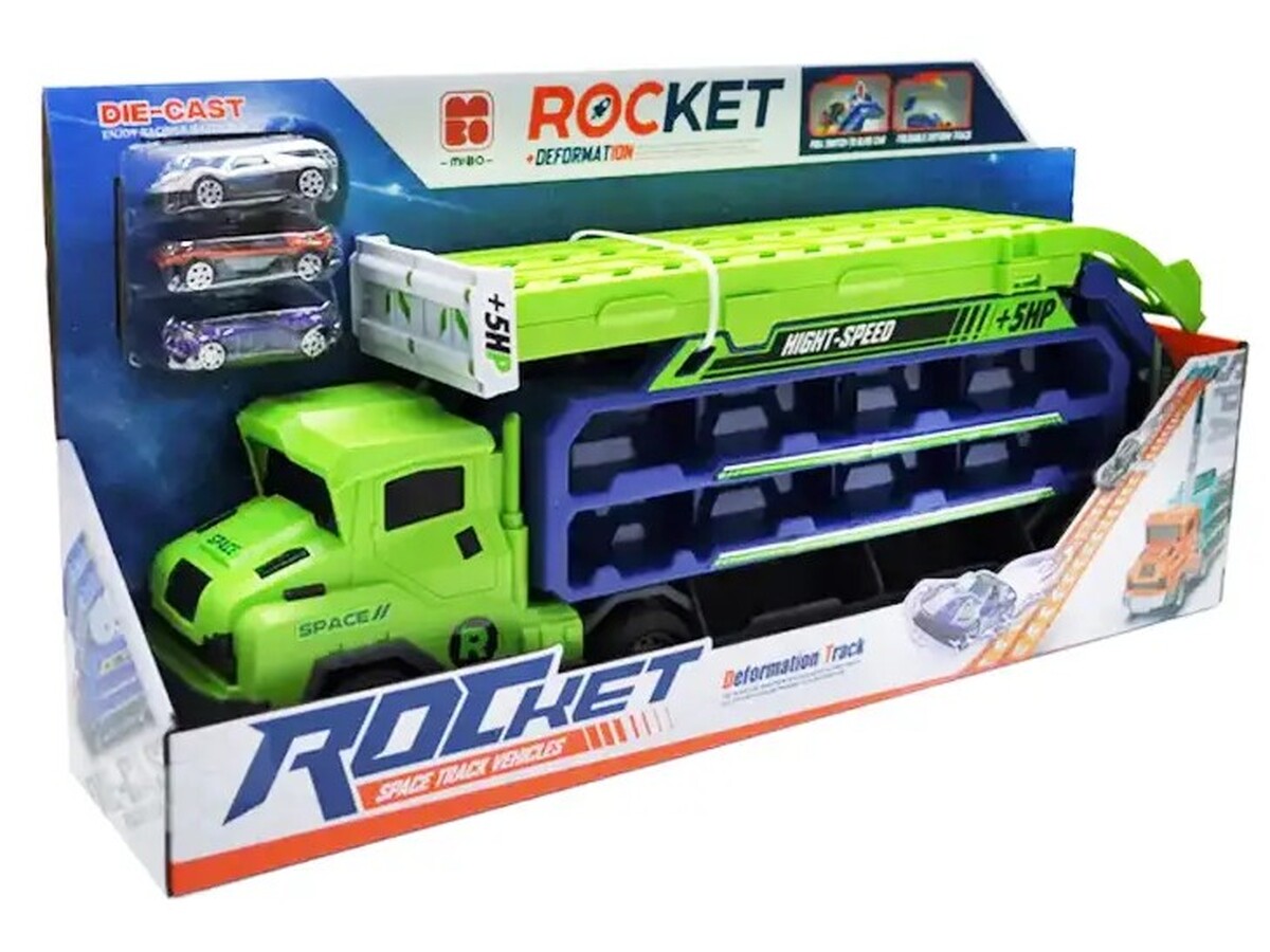 Wyjątkowa ciężarówka transportowa to jednocześnie pojazd i tor ze zjeżdżalnią dla samochodów. Zestaw dostarcza mnóstwa możliwości fantastycznej zabawy, jazdę samochodzikami, wyścigi, zjeżdżanie czy też bezpieczny transport autek w specjalnie przygotowanych do tego kabinach po obu bokach tira. Znajdziemy tam aż 20 miejsc do transportowania, dzięki czemu dziecko może przewozić także inne samochodziki ze swojej prywatnej kolekcji.