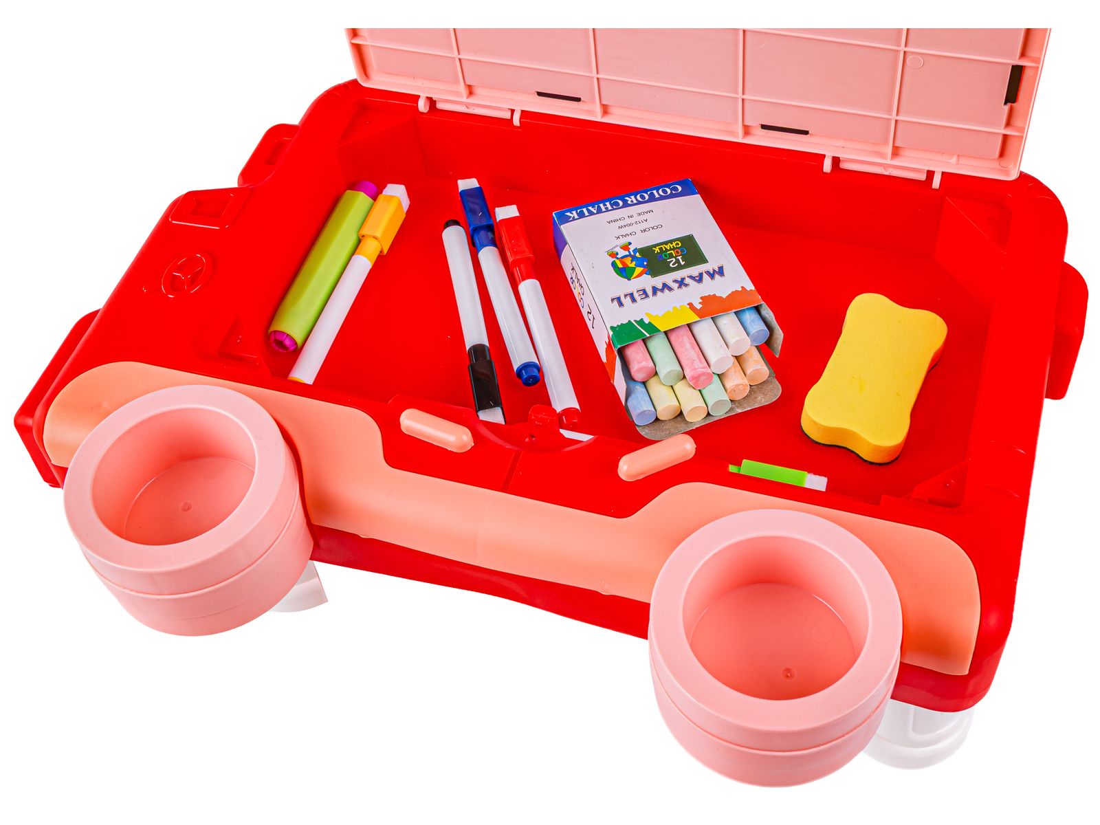 1 zabawka wiele możliwościJedna strona to zmazywalna tablica do malowania pisakami. Zestaw zawiera kolorowe pisaki oraz gąbeczkę do wymazywania. Druga strona to tablica kredowa, która również pozwala rozwinąć twórcze zdolności. Do tablicy kredowej załączona została kolorowa kreda (12 sztuk) + specjalny długopis do jej trzymania. | ![]() |