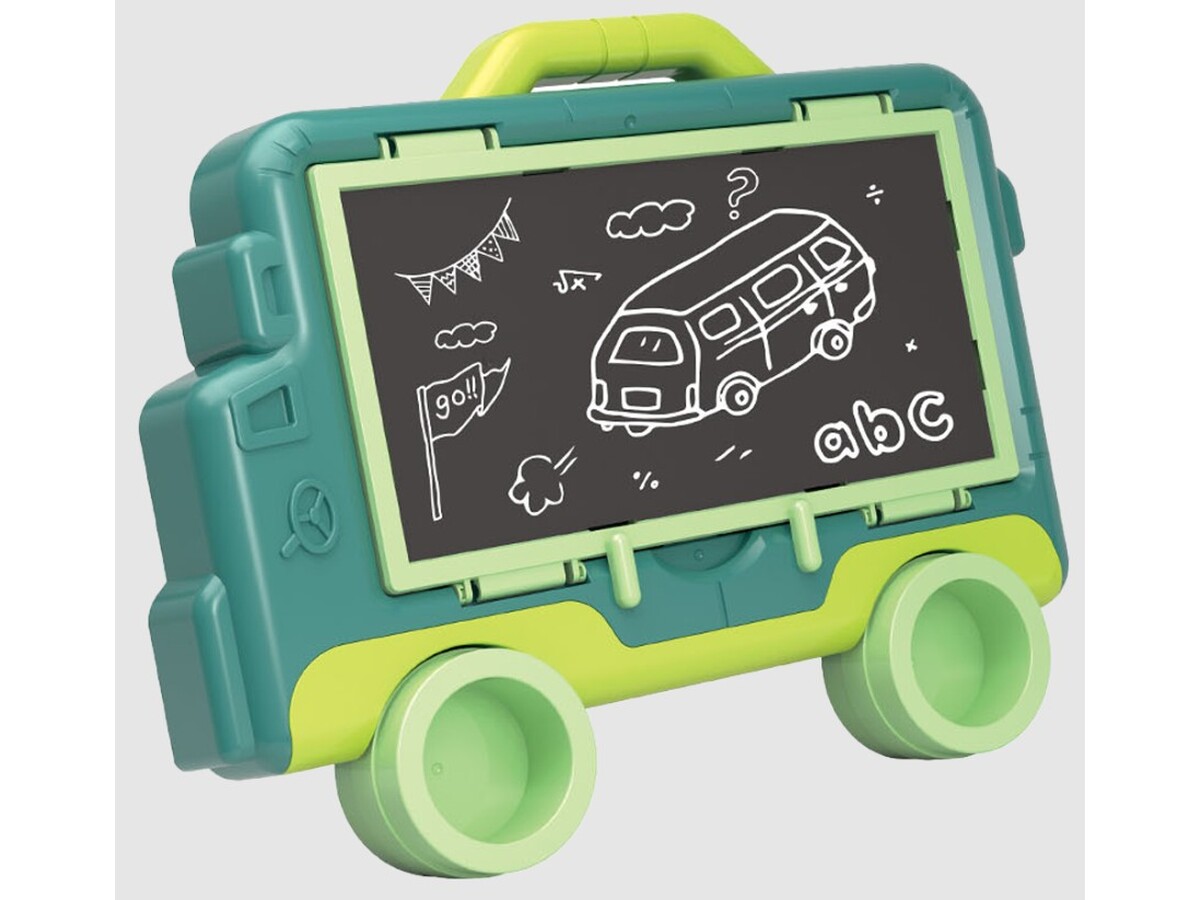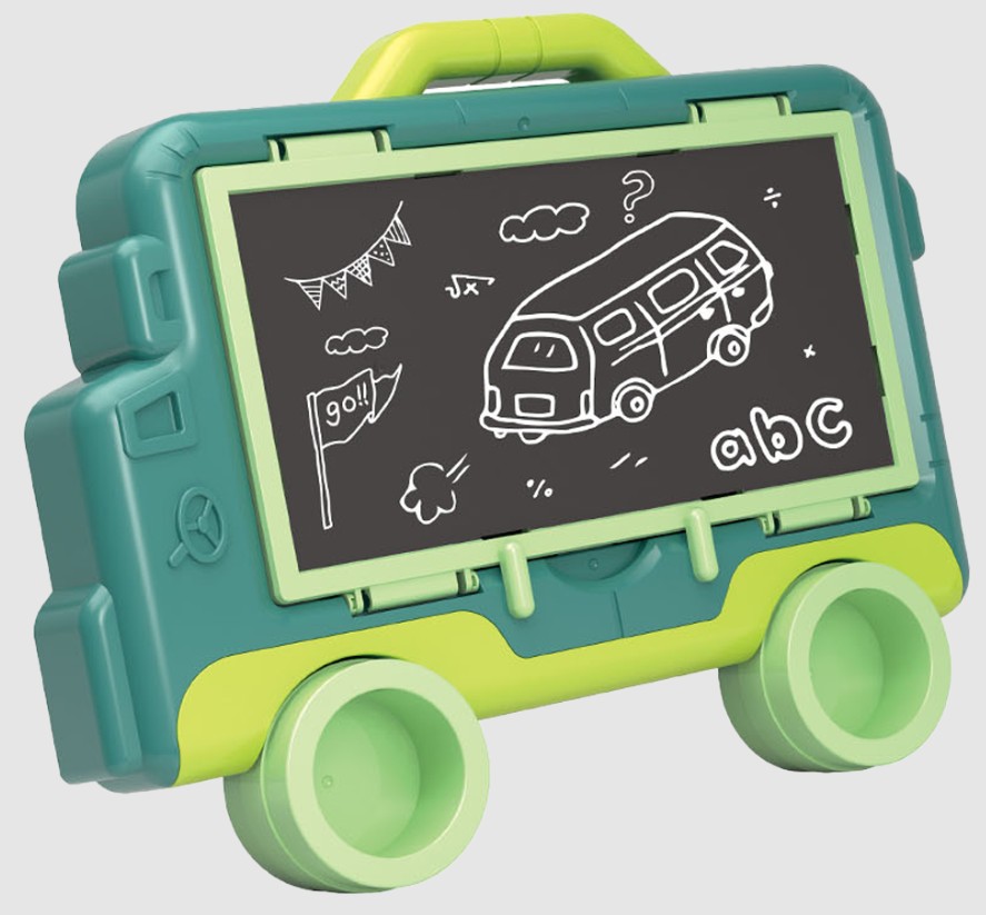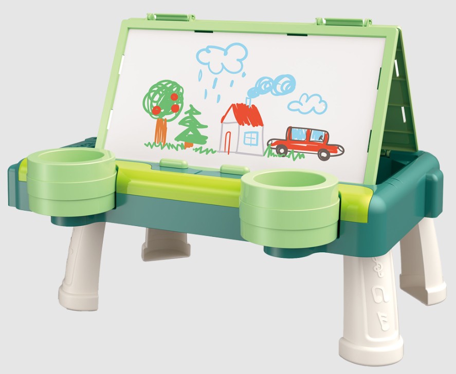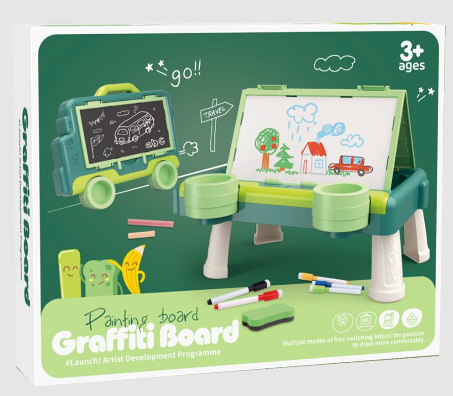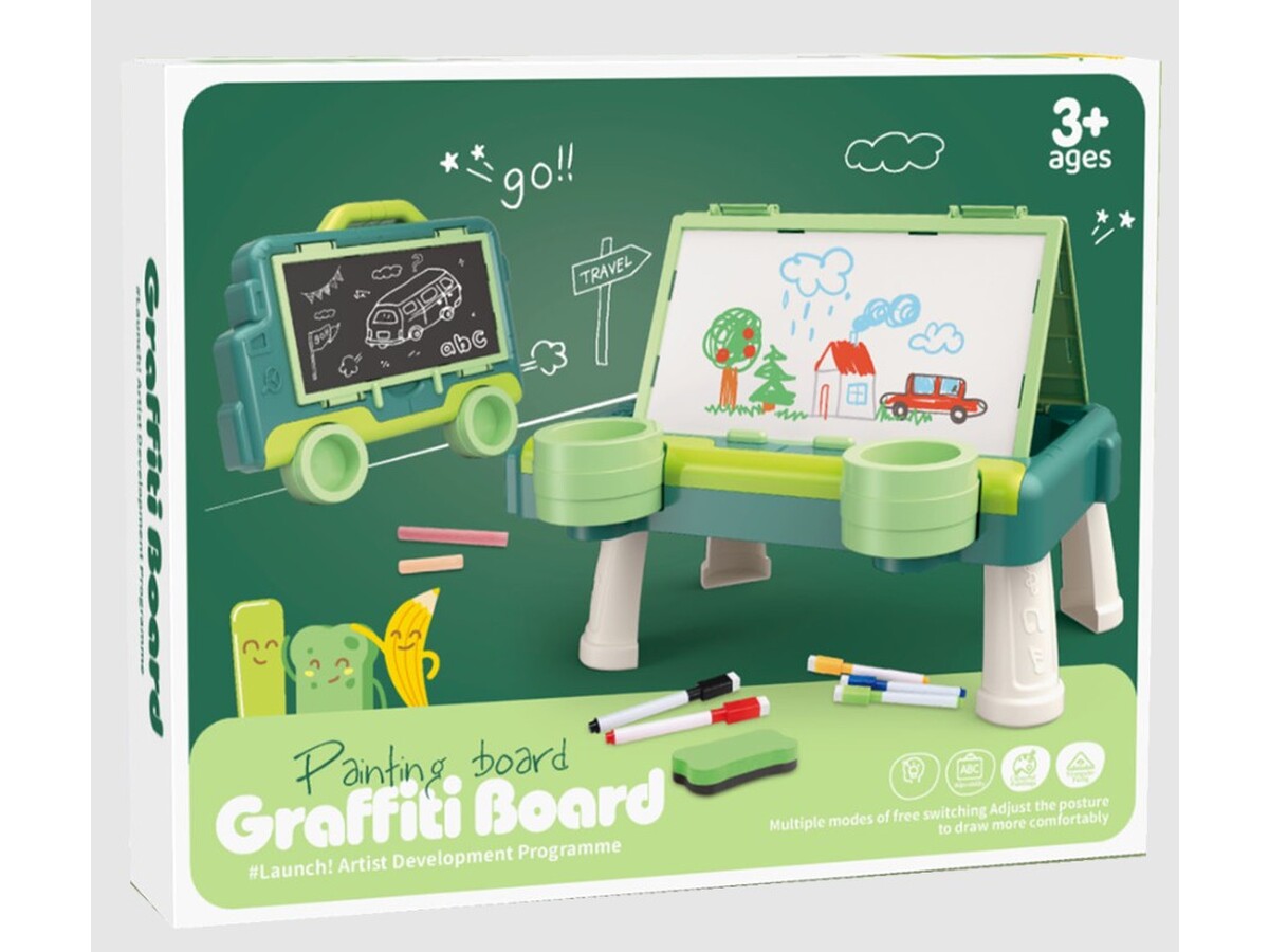 Jedna strona to zmazywalna tablica do malowania pisakami. Zestaw zawiera kolorowe pisaki oraz gąbeczkę do wymazywania. Druga strona to tablica kredowa, która również pozwala rozwinąć twórcze zdolności.