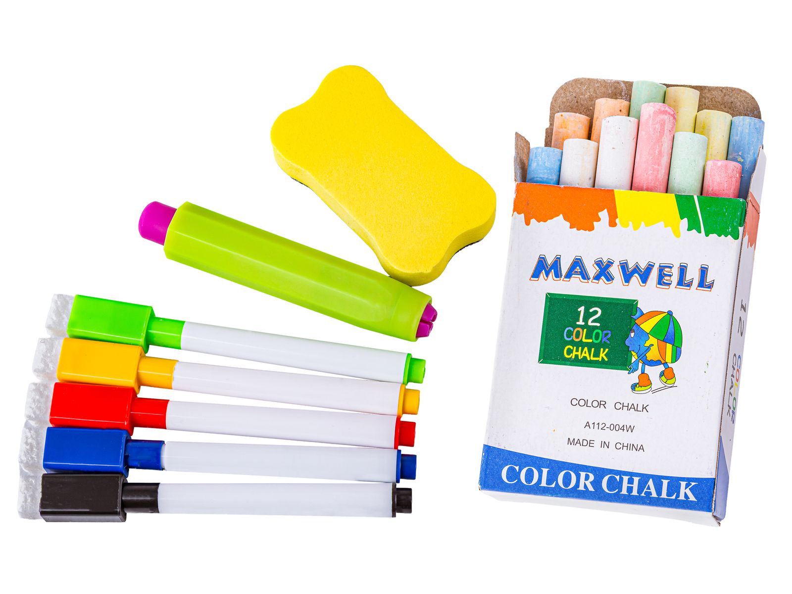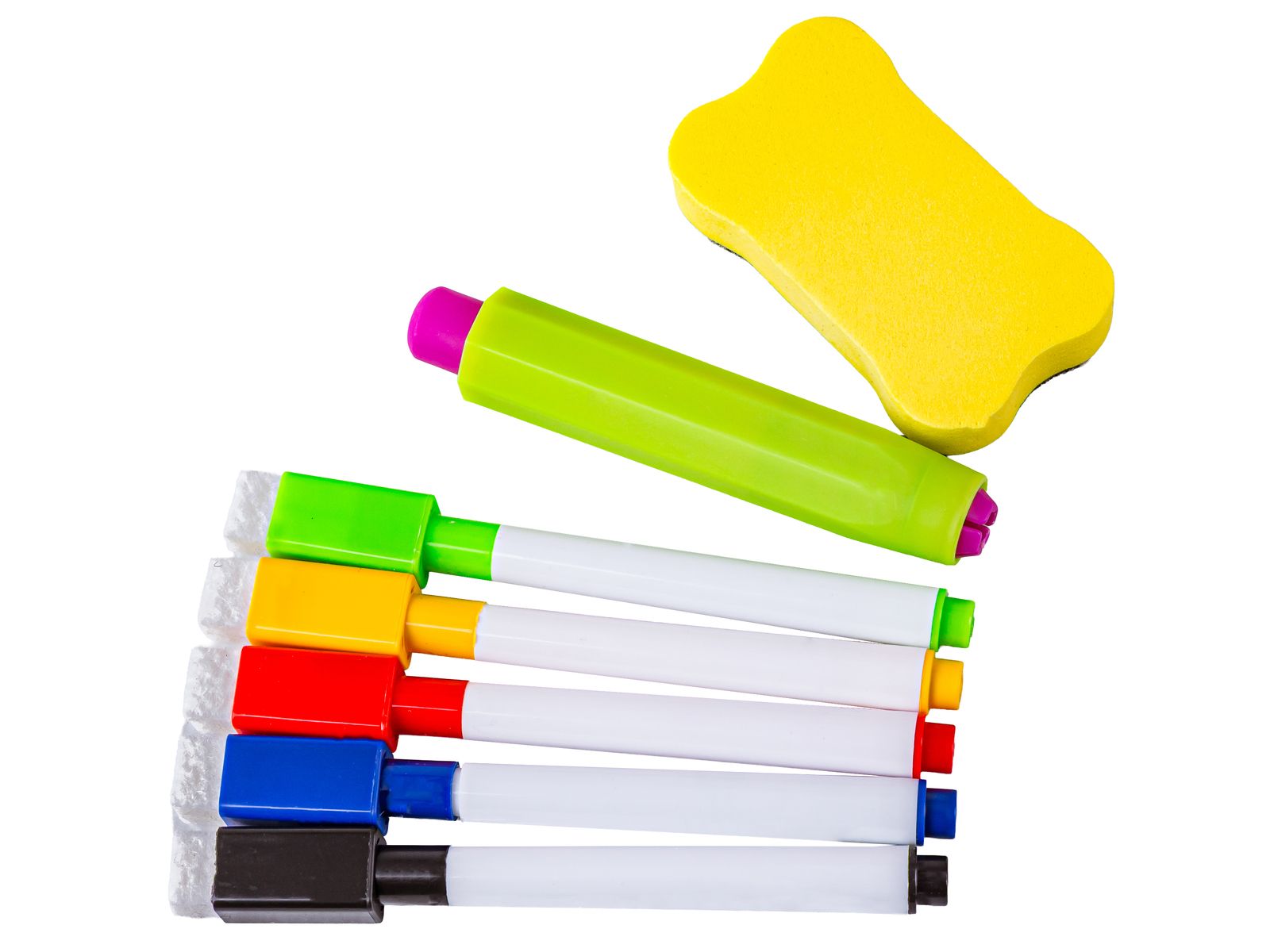 1 zabawka wiele możliwościJedna strona to zmazywalna tablica do malowania pisakami. Zestaw zawiera kolorowe pisaki oraz gąbeczkę do wymazywania. Druga strona to tablica kredowa, która również pozwala rozwinąć twórcze zdolności. Do tablicy kredowej załączona została kolorowa kreda (12 sztuk) + specjalny długopis do jej trzymania. | ![]() |