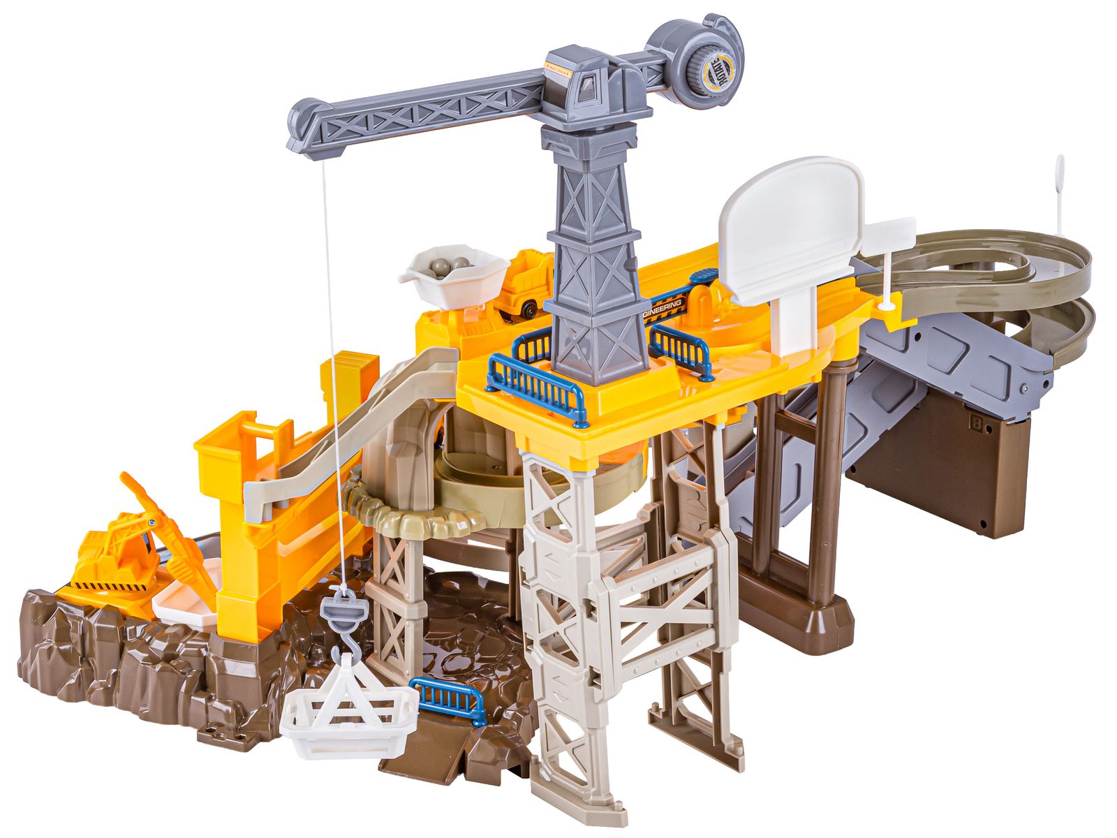 Na najwyższy poziom zestawu dostaniemy się dwoma ruchomymi podjazdami z efektami dźwiękowymi. Duży dźwig z koszykiem transportuje kulki na specjalnie przygotowany dla nich tor. To super zabawa.